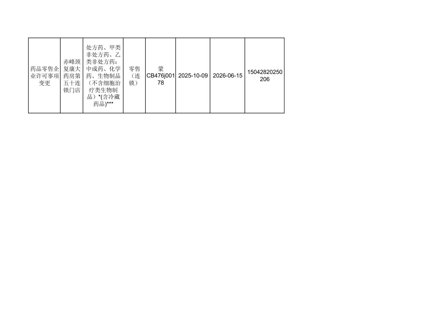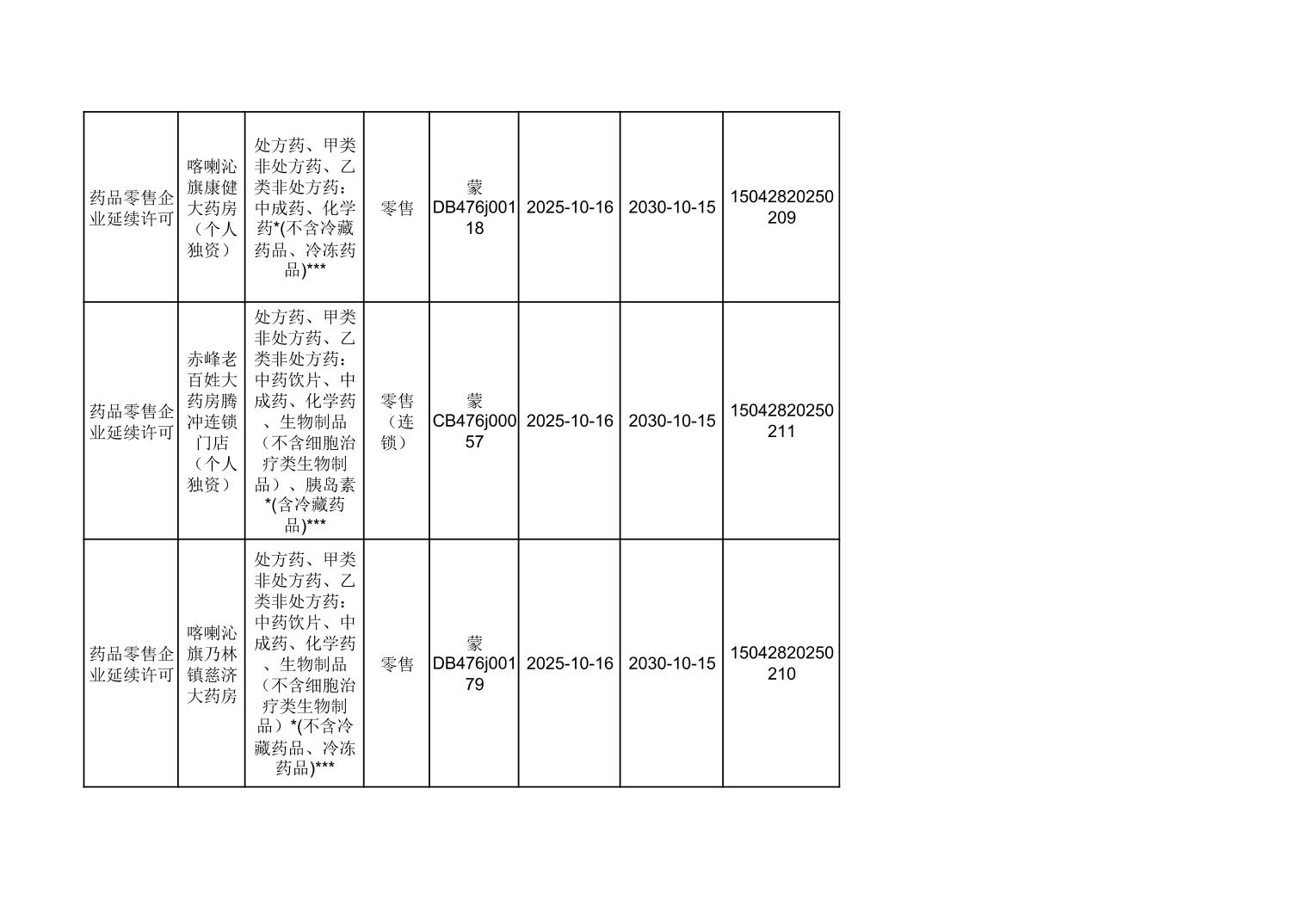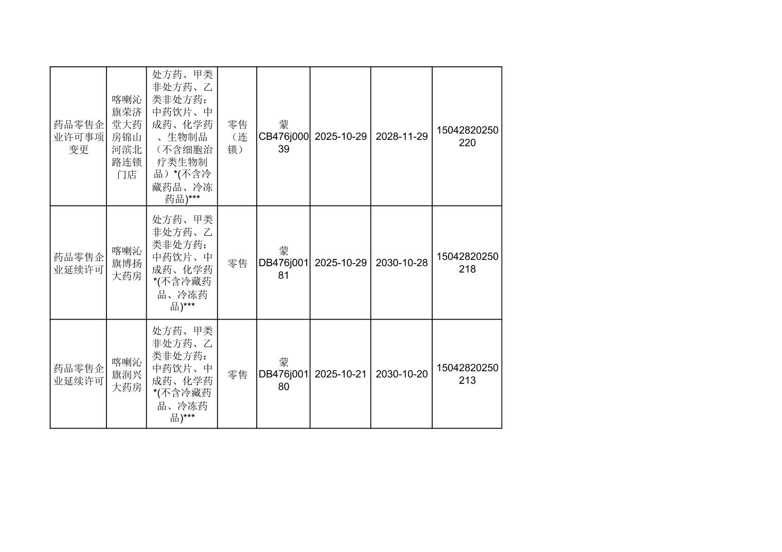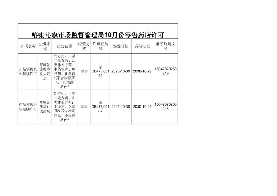 喀喇沁旗市场监督管理局10月份零售药店许可