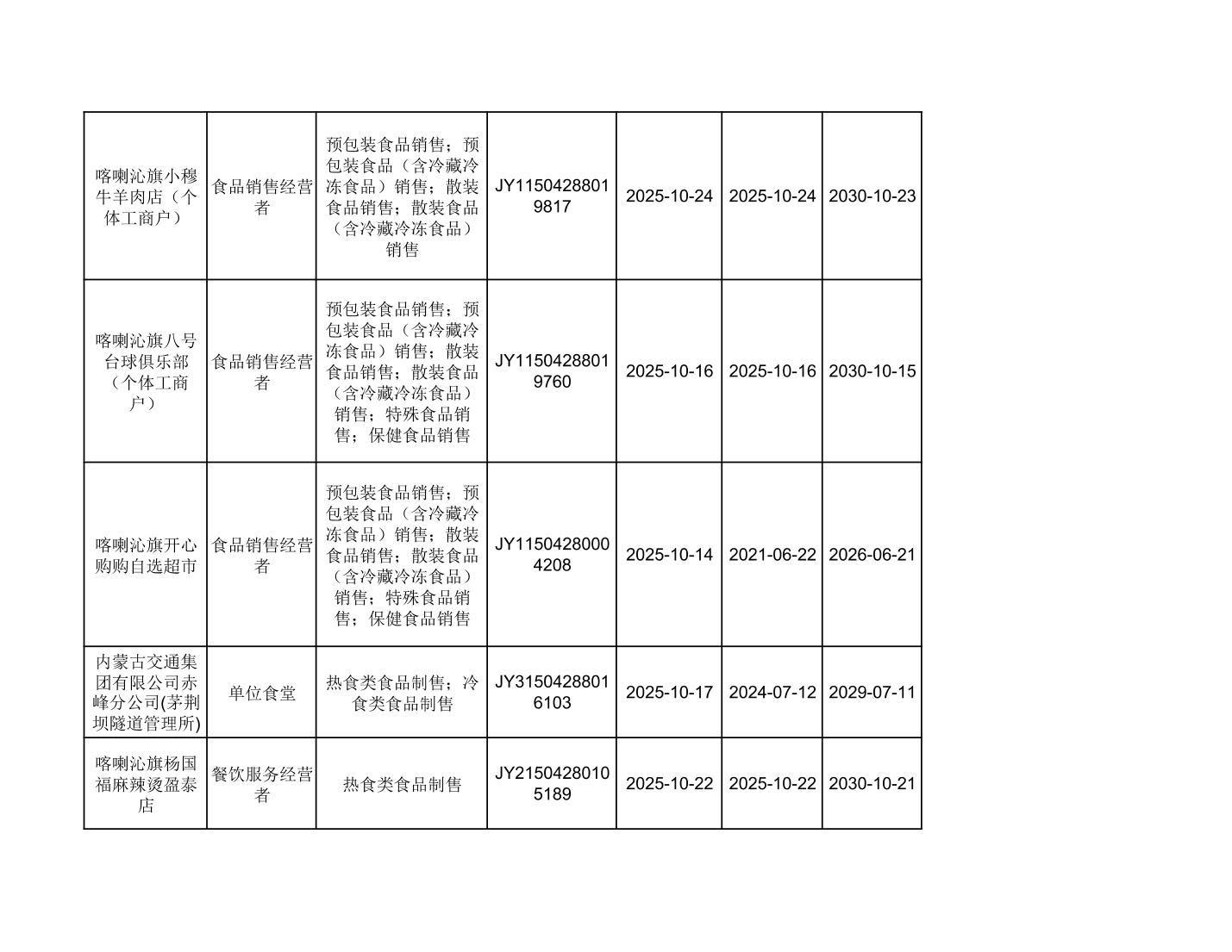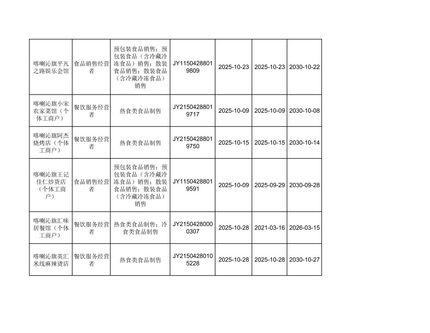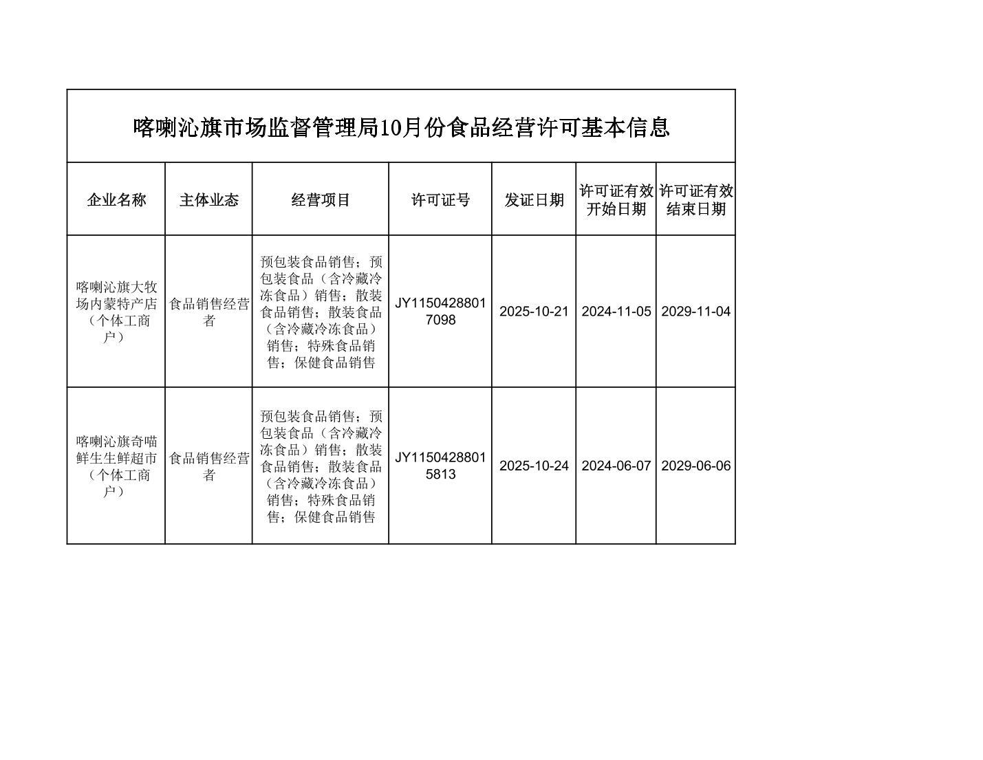 喀喇沁旗市场监督管理局10月份食品经营许可基本信息
