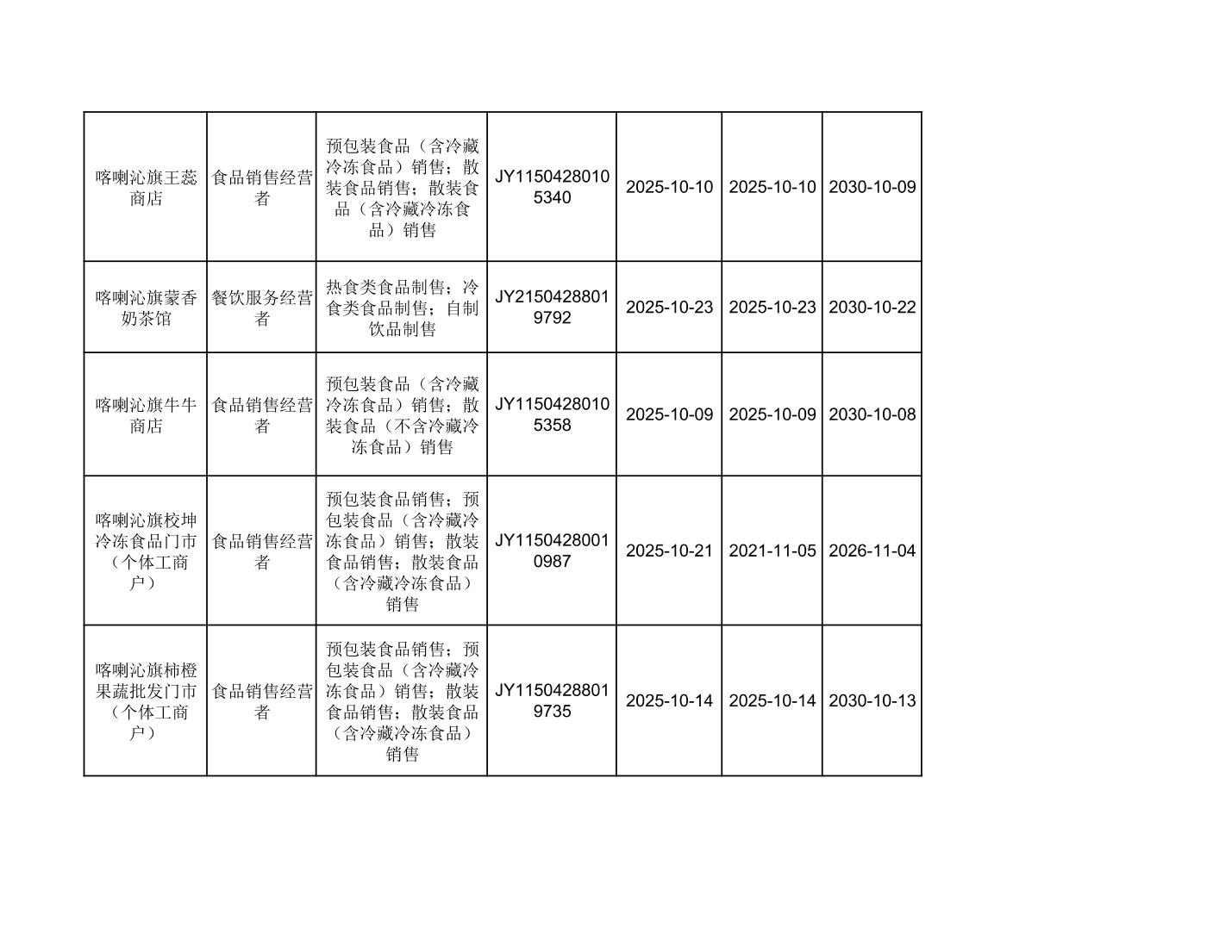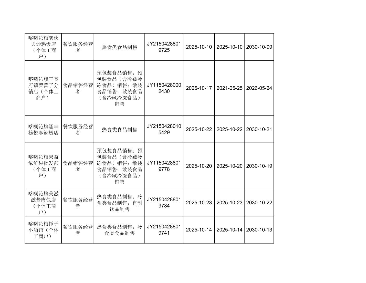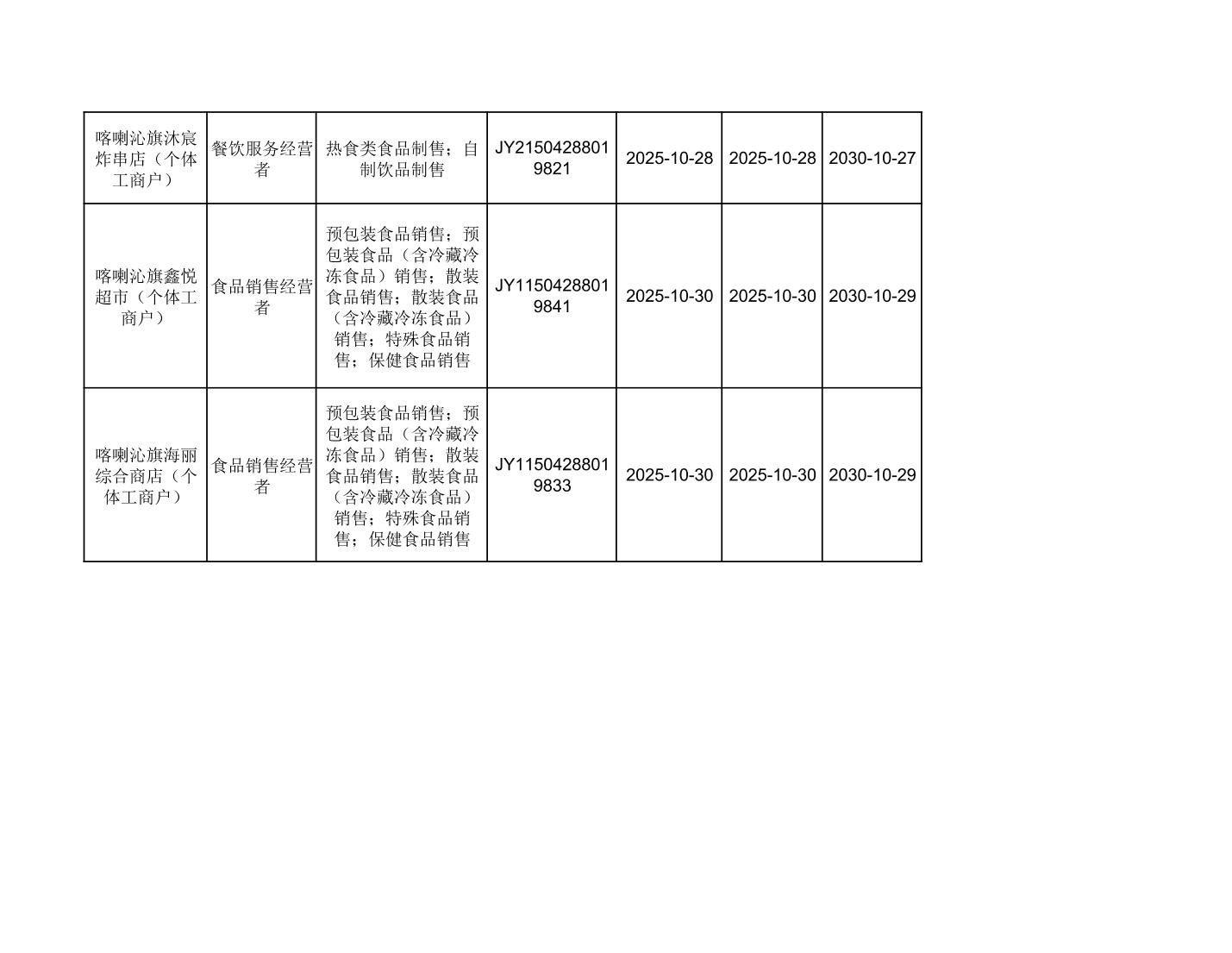 喀喇沁旗市场监督管理局10月份食品经营许可基本信息