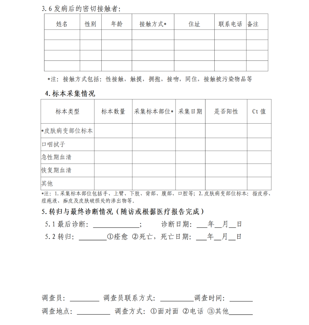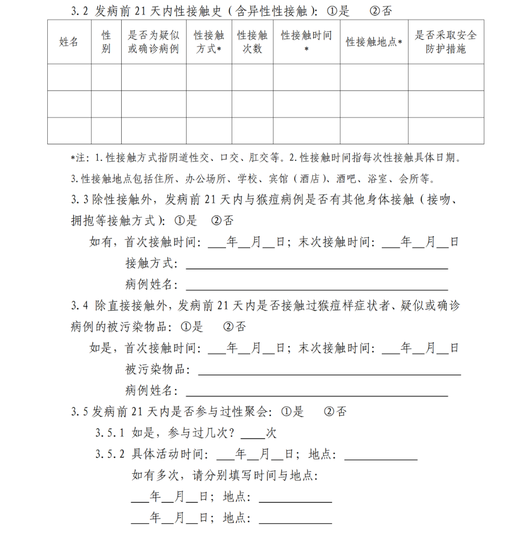 为指导各地疾控机构规范开展猴痘疑似病例、确诊病例和聚集性疫情的流行病学调查,及时掌握病例暴露史、接触史等流行病学相关信息,落实密切接触者的追踪判定,防止疫情传播扩散,制定本指南。(三)及时发现潜在的风险人群及其特征、范围,有针对性地开展宣传教育和综合干预。通过查阅资料,询问病例、诊治医生、家属和知情人等进行流行病学调查。如病例的病情允许,调查时应先调查病例本人,再对其诊治医生、家属和知情者进行调查。开展个案调查时,要认真、详细了解和记录病例基本信息、发病就诊情况、临床表现、转归及实验室检测信息;发病前21天内与可疑感染来源的接触史、接触场所及接触方式;发病后至隔离治疗前的具体活动地点、与其有皮肤或黏膜直接接触者,以及发病前4天内与其有性接触者。(一)基本情况。如姓名、性别、年龄、住址、国籍、联系方式等。(二)发病就诊情况。临床表现、实验室检测、发病就诊经过和病情变化与转归。(三)感染来源调查。对病例发病前21天内的暴露史开展调查,包括境内外猴痘病例报告地区旅行史或居住史,对可疑的感染来源要详细询问接触时间、方式、频次、地点及接触时采取的防护措施等,特别是性接触史。调查时,若发现调查表中未列入,但具备重要流行病学意义的内容也应进行详细询问和记录。(四)密切接触者调查及判定。对病例传染期的活动情况和人群接触情况进行追踪和排查后,判定其密切接触者。密切接触者判定和管理按照《猴痘密切接触者判定和管理指南》(附件4)执行。按照“属地化管理”原则,由病例现住址所在的县(市、区)级疾控部门组织辖区疾控机构开展猴痘病例的流行病学调查,就诊医疗机构提供诊疗信息。调查单位应根据调查计划和调查目的,确定调查人员组成和职责分工,及时开展病例流行病学个案调查。调查过程中发挥多部门联防联控的协同作用,尽可能获取全面准确的流调信息。调查期间,调查人员要做好个人防护。疾控机构完成调查后,应做好病例分析总结,及时将流行病学个案调查表、调查报告等资料逐级报送上级疾控机构,并做好调查资料的保管和存档。病例流调信息要按有关规定,严格做好信息安全和个人隐私信息保护。
