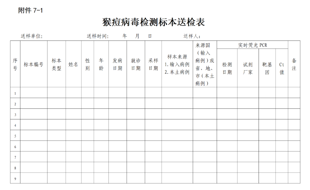 ④仪器检测通道选择:使用荧光定量PCR检测仪,选择Fam荧光信号检测通道,收集设在60℃。具体设置方法参照各仪器使用说明书。⑤结果分析阈值设定:使用荧光定量PCR检测仪进行结果分析时,基线取3-10或6-15个循环的荧光信号,阈值设定原则为阈值线刚好超过正常阴性对照扩增曲线最高点,也可根据仪器噪音情况调整阈值。①Real-time PCR反应系统的质量控制:反应结果应同时符合以下2个条件,否则试验结果无效,应重新开展检测。阴性对照无扩增,为阴性。阳性对照未出现阴性结果。所有阳性和处于灰区的标本应重复检测或经序列分析进行确诊。需注意:当标本仅为咽拭子或血清、血浆,且检测结果为阴性时,应结合临床症状,慎重做出阴性诊断。做好荧光定量实时PCR方法检测猴痘病毒核酸原始记录。1.测序标本选取原则。本土疫情中的首发或早期病例、与早期病例有流行病学关联的关键病例、感染来源不明的本土病例、境外输入病例阳性标本等。以上标本在核酸荧光定量PCR检测Ct值≤32时进行测序(关键样本除外)。2.测序要求。以省为单位确定开展猴痘病毒全基因组测序的机构。建议使用扩增子技术进行猴痘病毒全基因组测序。测序数据经质控合格后方可用于后续生物信息分析。二代测序平台覆盖深度应不低于10×,三代测序平台覆盖深度应不低于50×,全基因组测序覆盖度应不低于98%。数据比对分析推荐参考猴痘基因组NC_063383.1。各省应建立本省输入、本土病例猴痘病毒基因组数据库,应具备序列对比分析能力。具备测序条件的省份要在接收标本后48小时内开展测序工作,关键样本要求实验室收到标本后1周内提供测序结果报告,所有测序原始数据(一般为fastq格式)、组装序列(一般为fasta格式)和标本序列测定结果报告单(见附件7-2)应在获得序列48小时内报送中国疾控中心病毒病所进行序列汇总、分析。病毒病所应将序列分析结果及时反馈各省,并将全国猴痘病毒序列汇总、分析结果及时上报国家疾控局。3.分子分型。推荐使用在线分析工具Nextclade(https:// clades.nextstrain.org)对变异株进行分子分型。