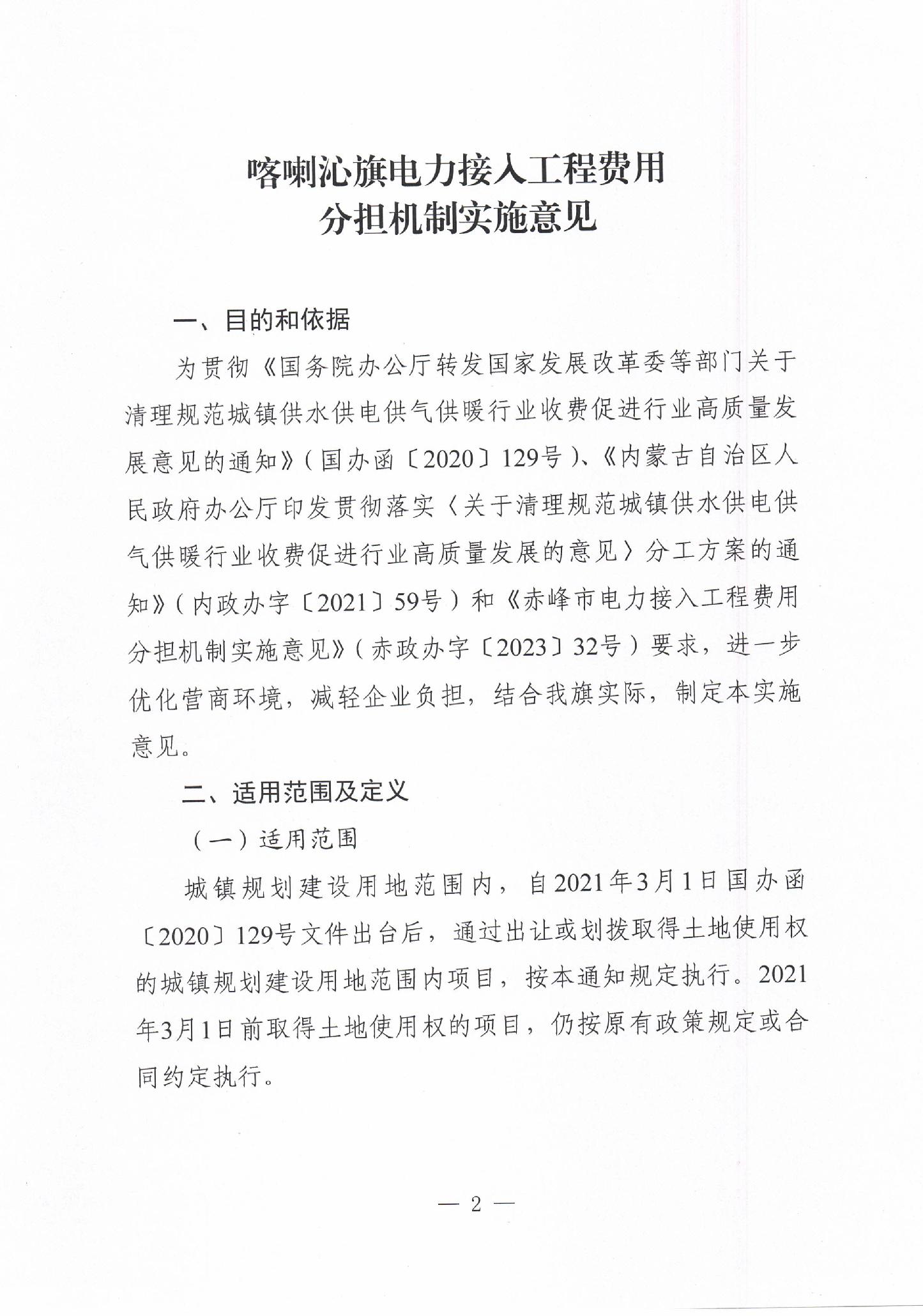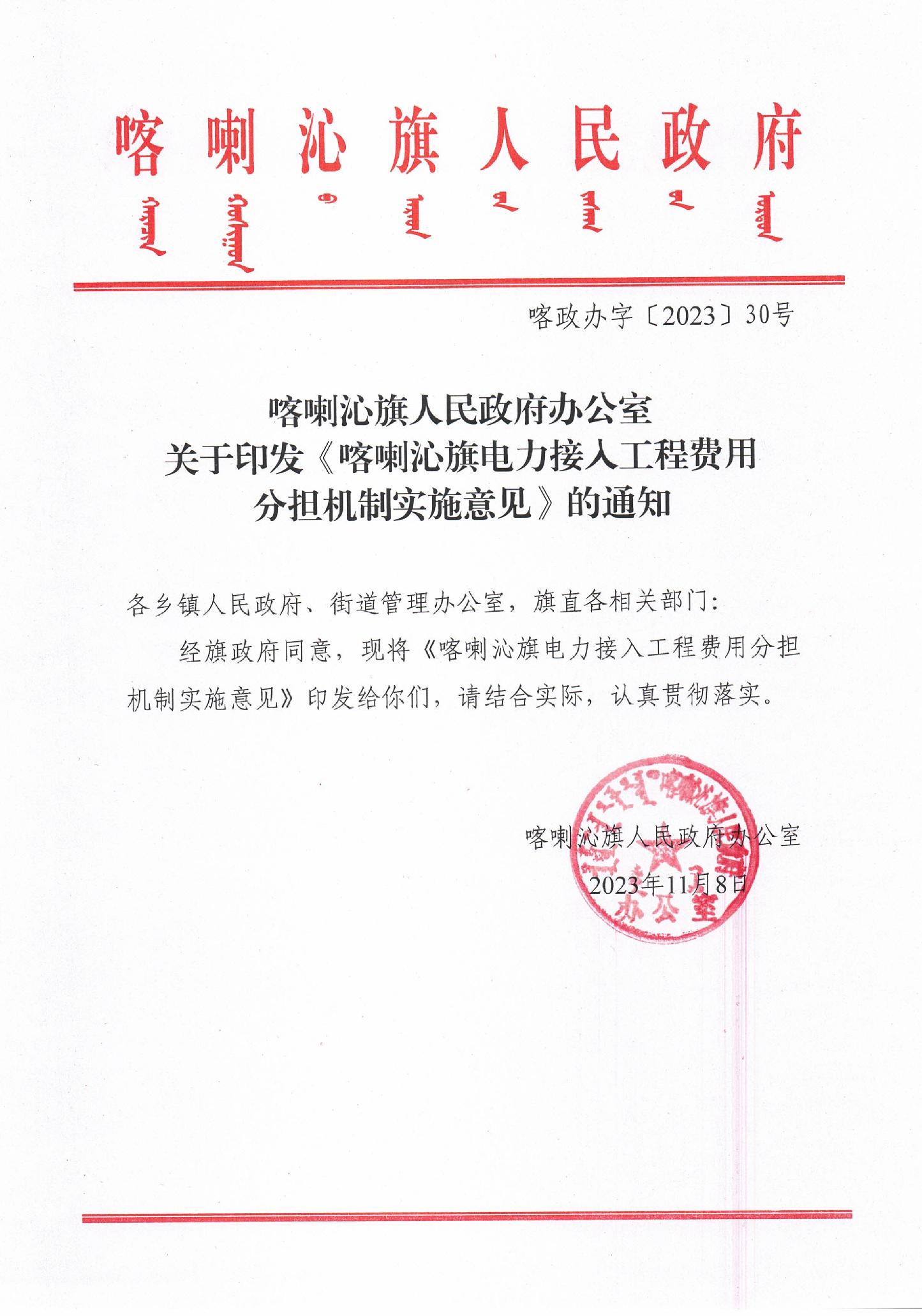 关于印发《喀喇沁旗电力接入工程费用分担机制实施意见》的通知