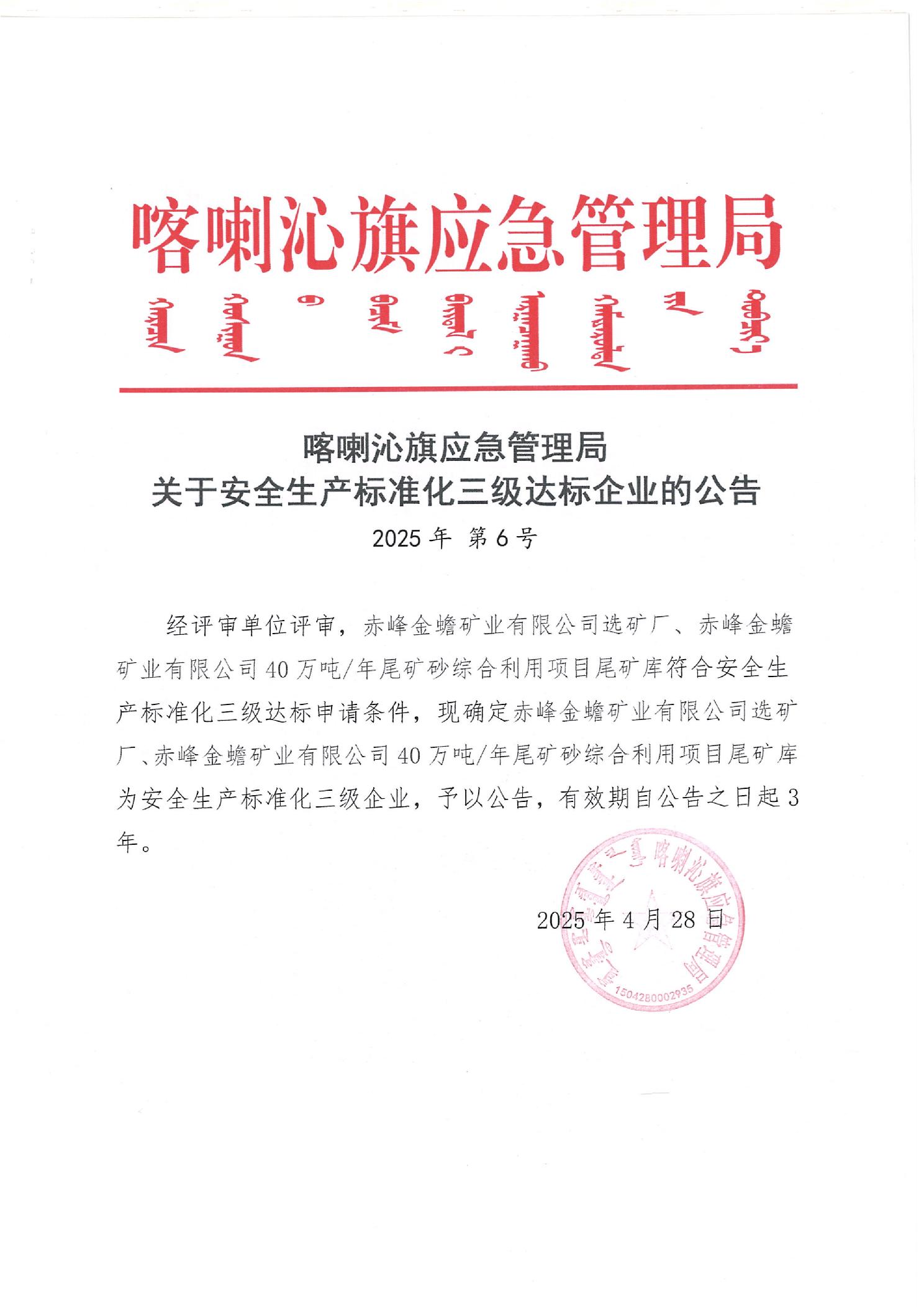 喀喇沁旗应急管理局关于安全生产标准化三级达标企业的公告