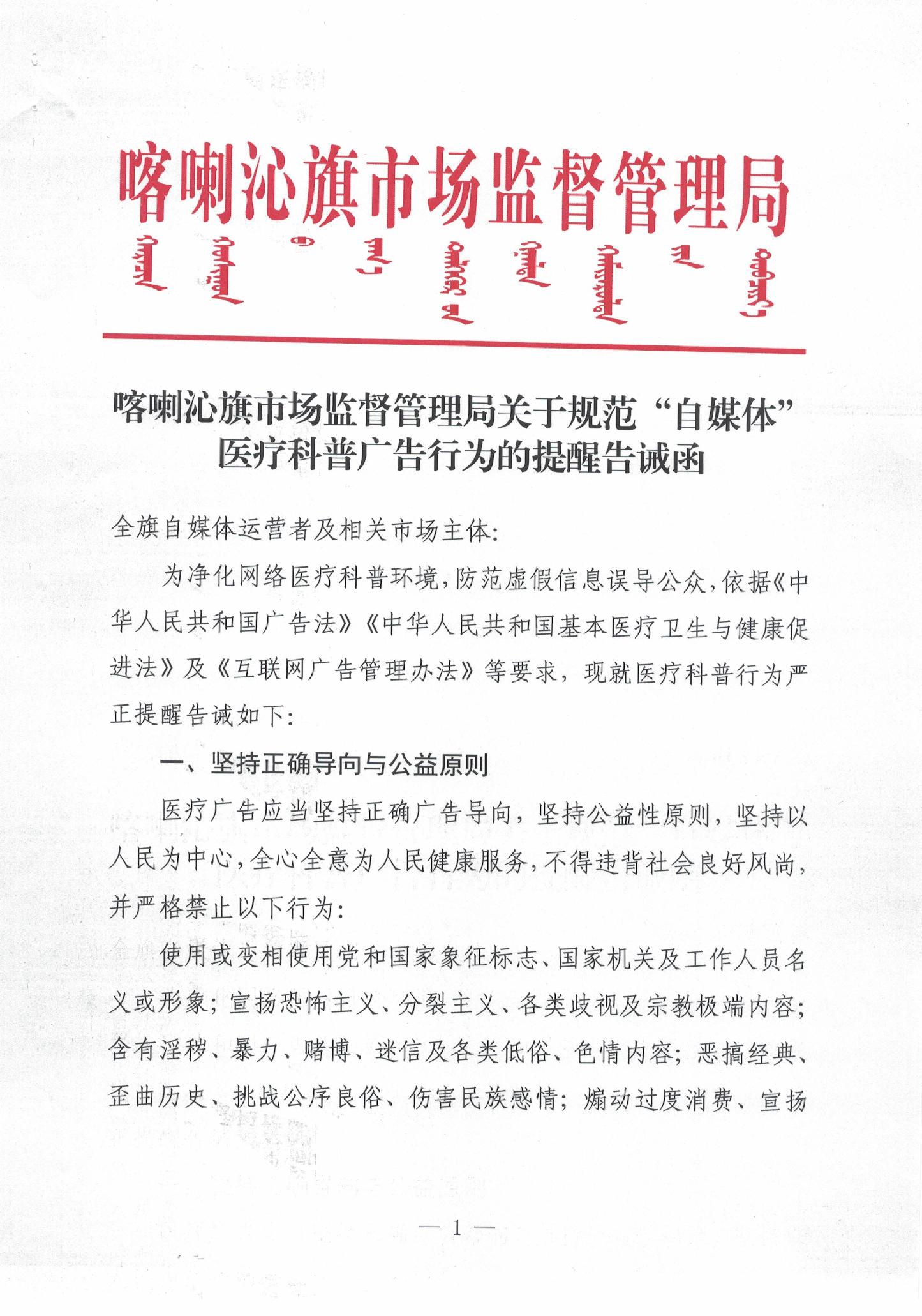 喀喇沁旗市场监督管理局关于规范“自媒体”医疗科普广告行为的提醒告诫函