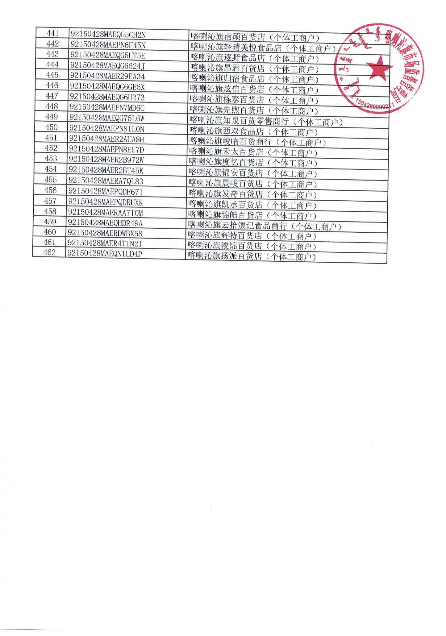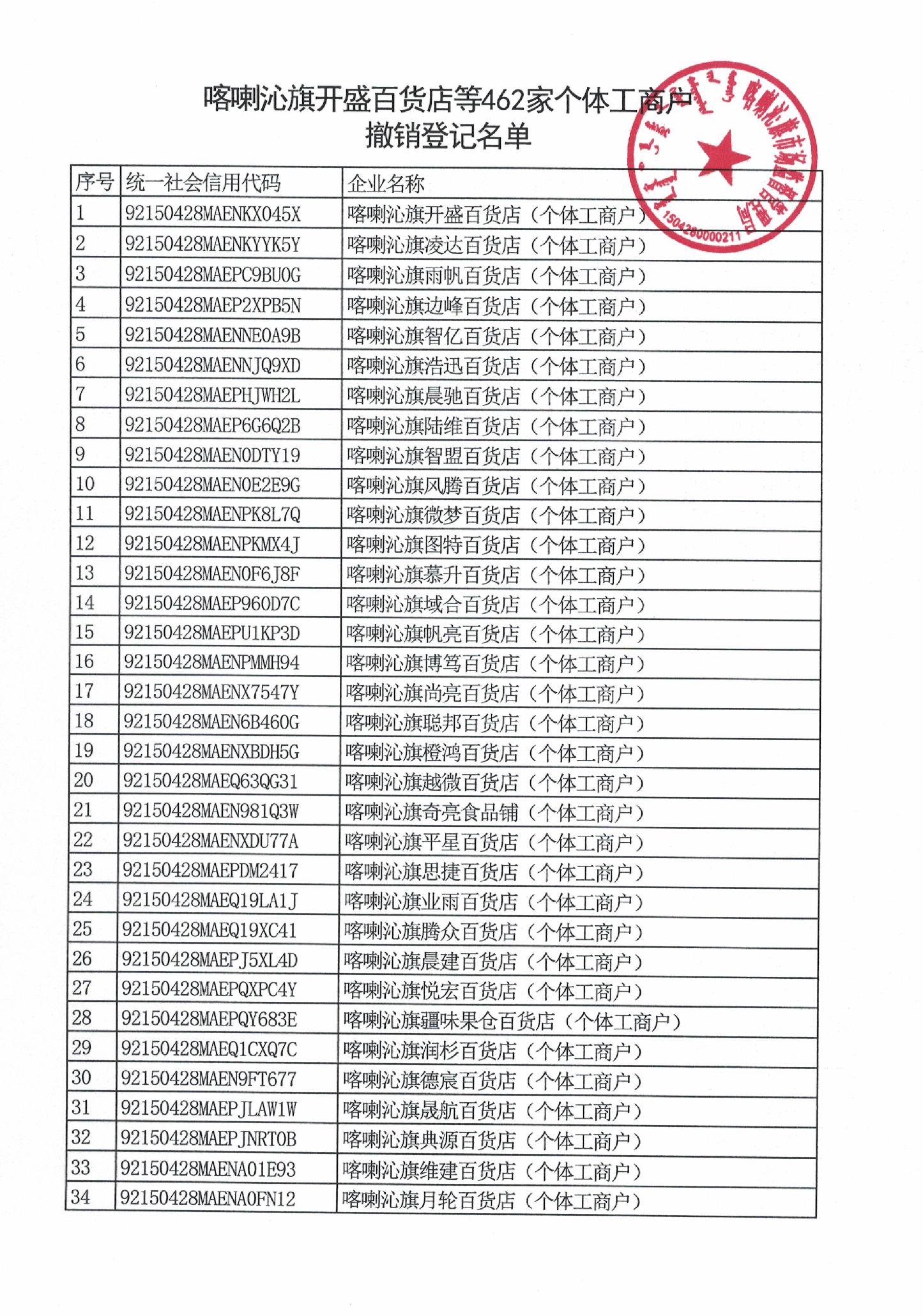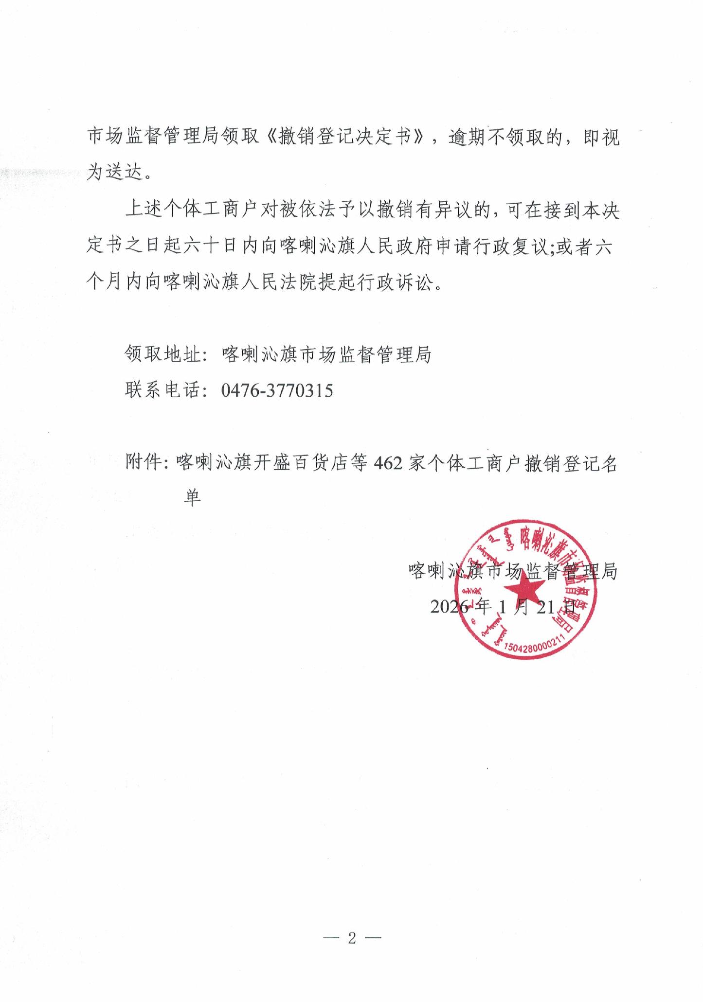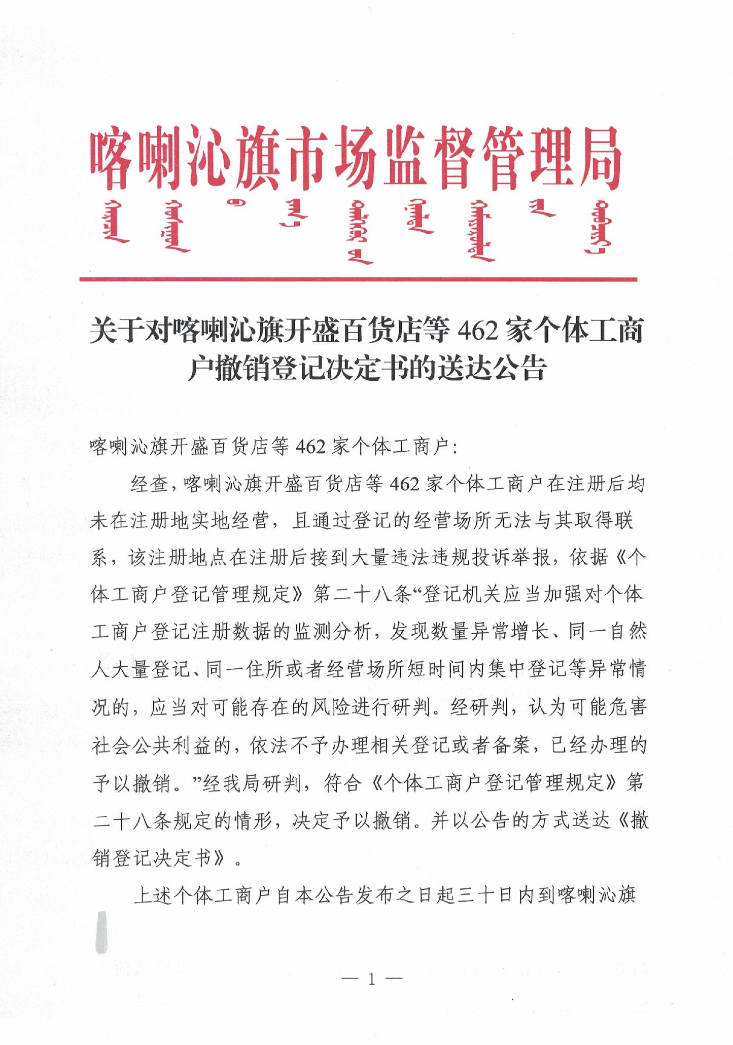 关于对喀喇沁旗开盛百货店等462家个体工商户撤销登记决定书的送达公告