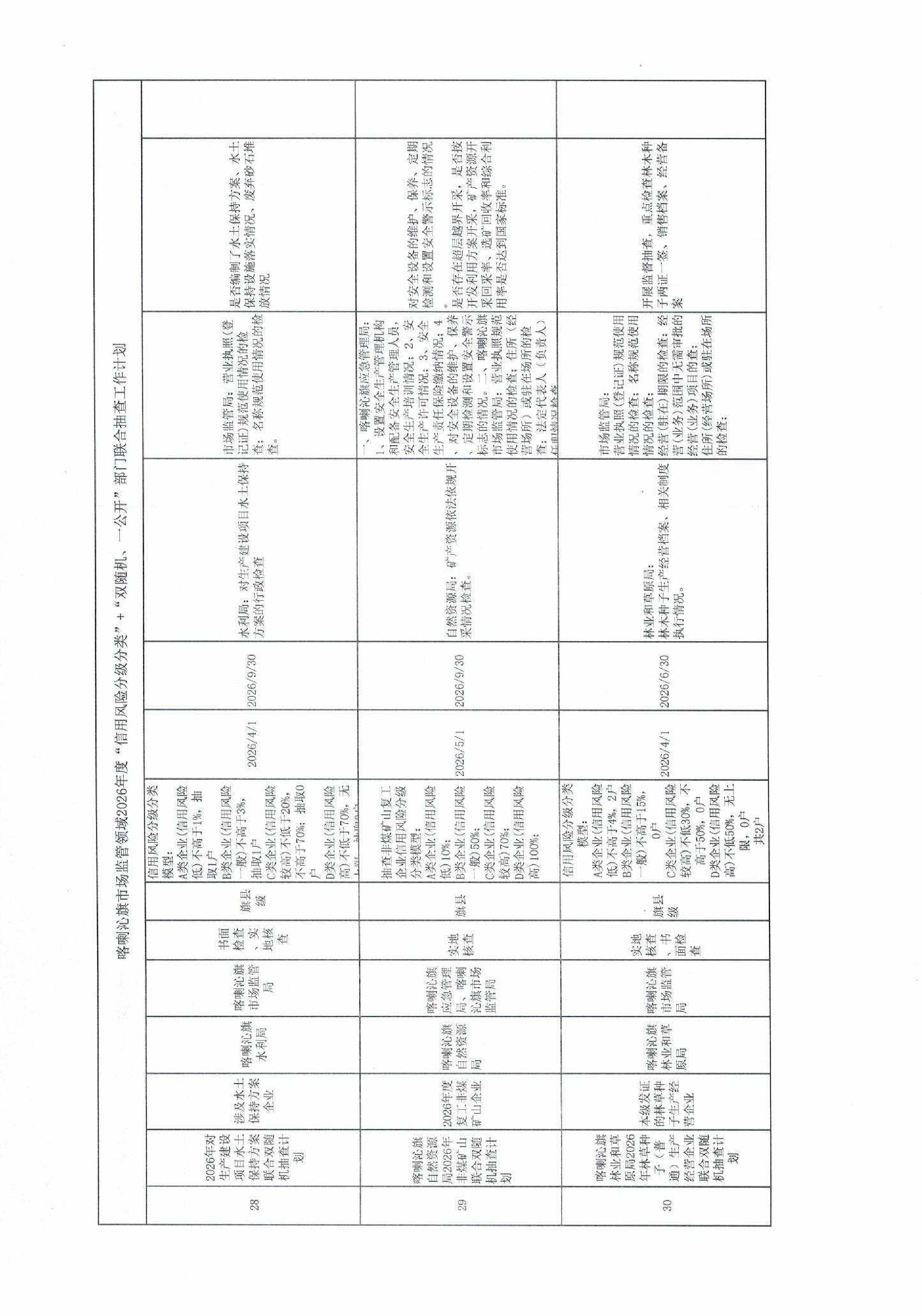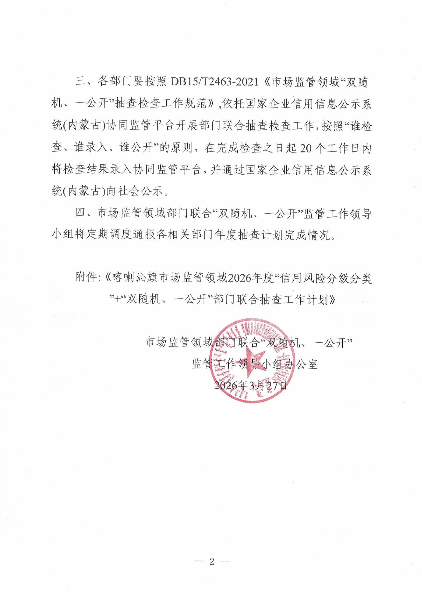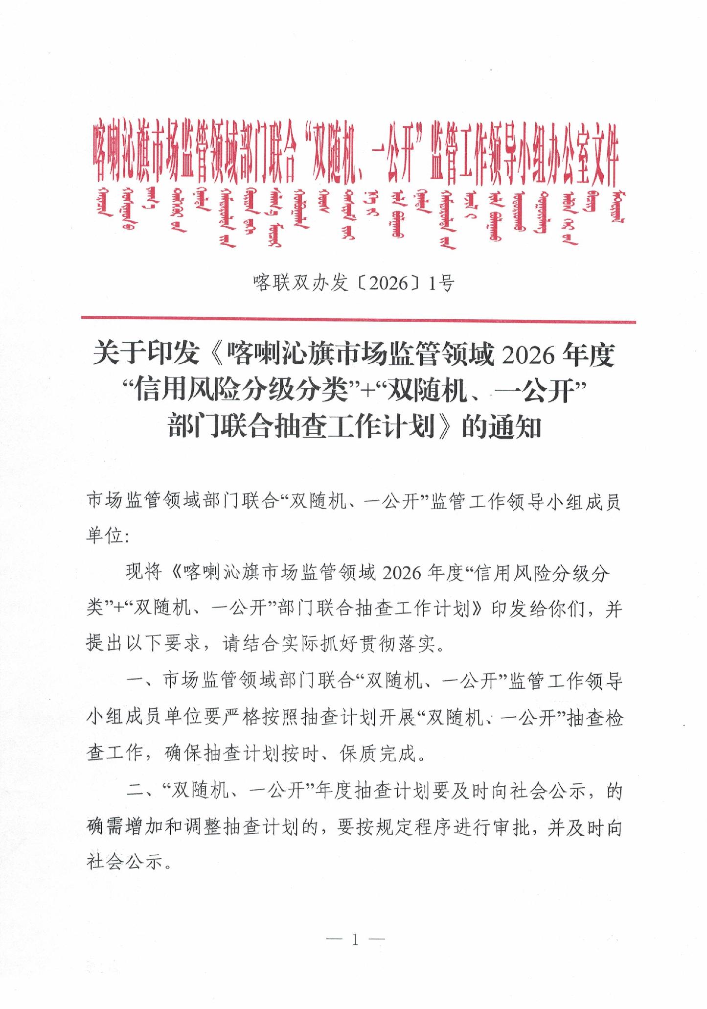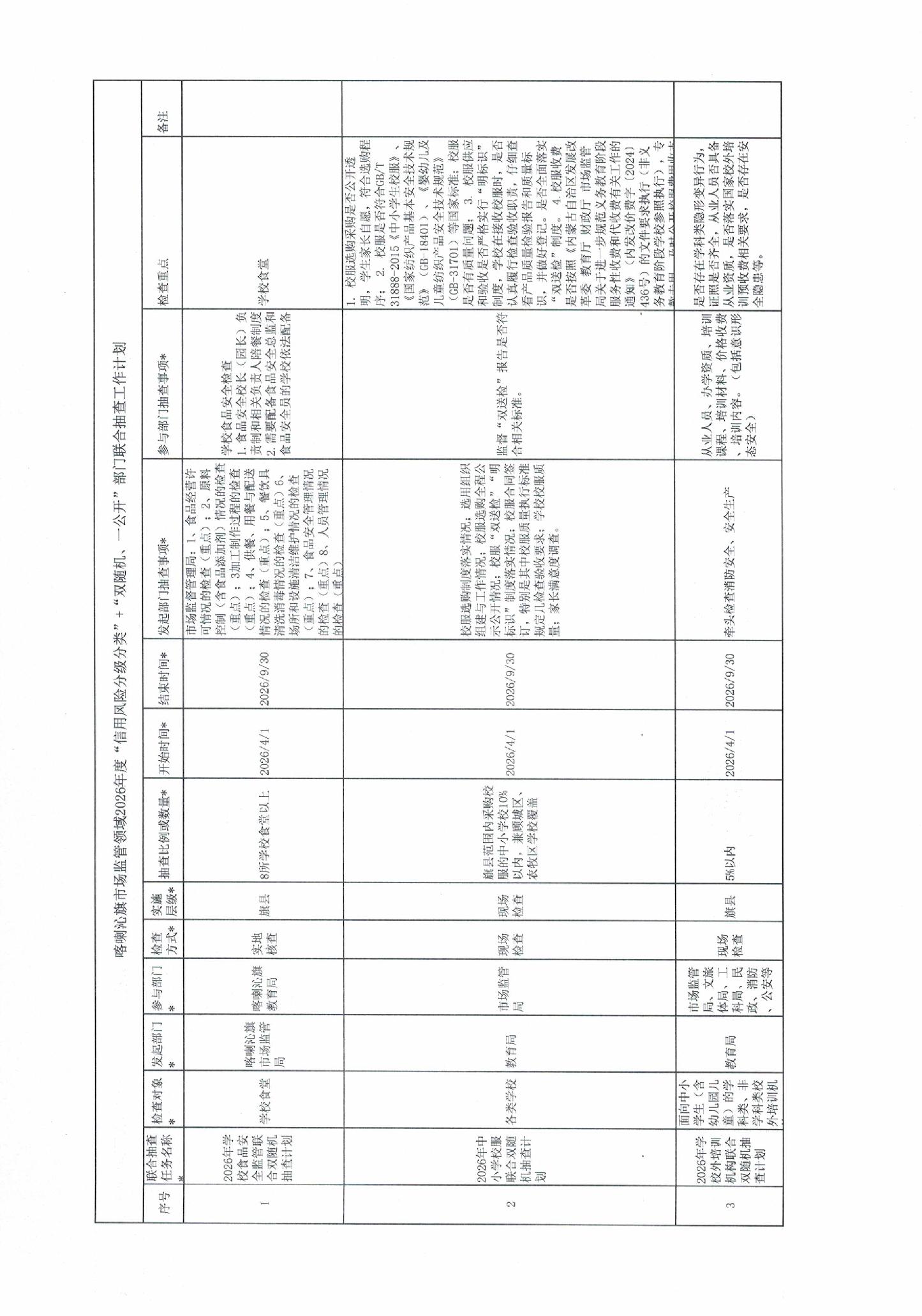 喀喇沁旗市场监管领域2026年度“信用风险分级分类”+“双随机、一公开”部门联合抽查工作计划