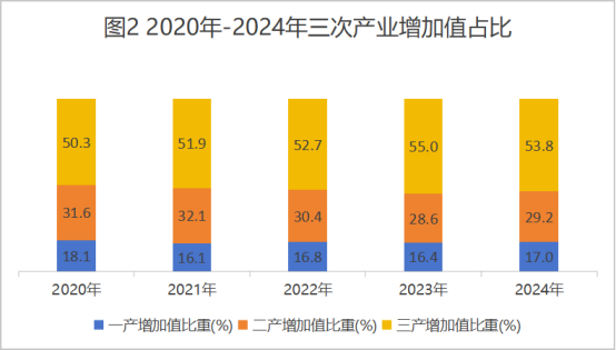 从产业结构看,三次产业比例为17.0:29.2:53.8。其中,第一产业比重较去年提高0.6个百分点,第二产业提高0.6个百分点,第三产业下降1.2个百分点;从增长速度看,第二产业增长11.8%,居三次产业之首,分别高于一、三产业4.1个和9.0个百分点;从贡献情况看,三次产业对经济增长的贡献率分别为22.0%、54.8%和23.2%;从拉动经济增长情况看,三次产业分别拉动经济增长1.39、3.45和1.46个百分点,第二产业分别高于第一、三产业2.06和1.99个百分点。