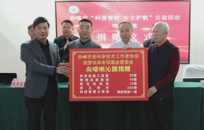1月25日下午,由赤峰市老科协联合筑梦未来专项基金管委会组织开展的“科普智教 安全护航”公益捐赠活动举行。赤峰市老科协会长钱荣旭、副会长兼秘书长曹明武,筑梦未来专项基金管委会秘书长宋立峰,喀喇沁旗委常委、政府副旗长史志良出席。旗教育局、受捐赠学校、幼儿园等主要负责同志参加。