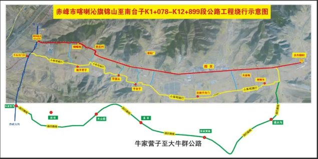 K1+078至K12+899段公路工程施工期间请经由该施工路段来往锦山、小牛群的车辆绕行Y003牛家营子至大牛群公路、C010牛头沟门至大金地公路。