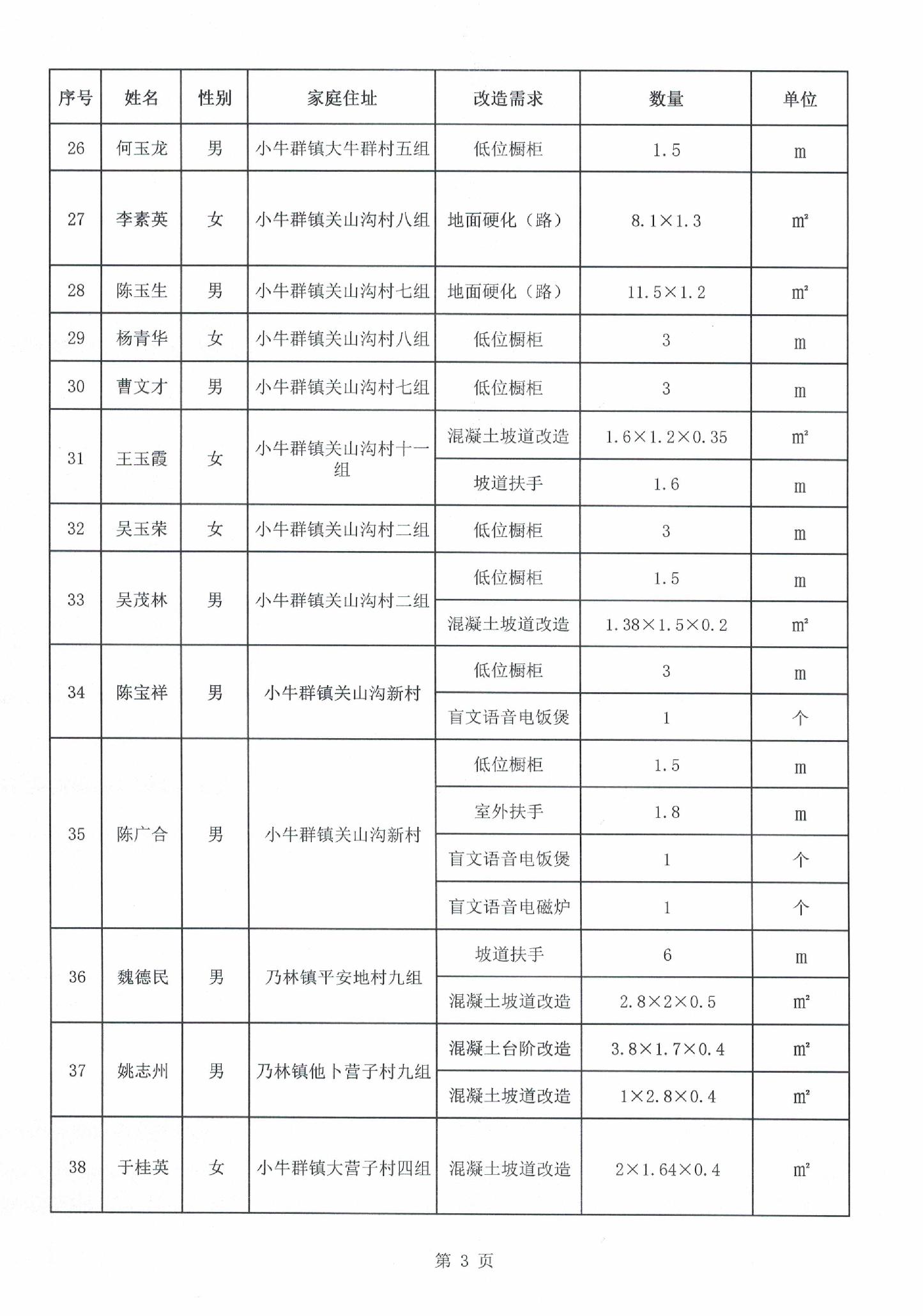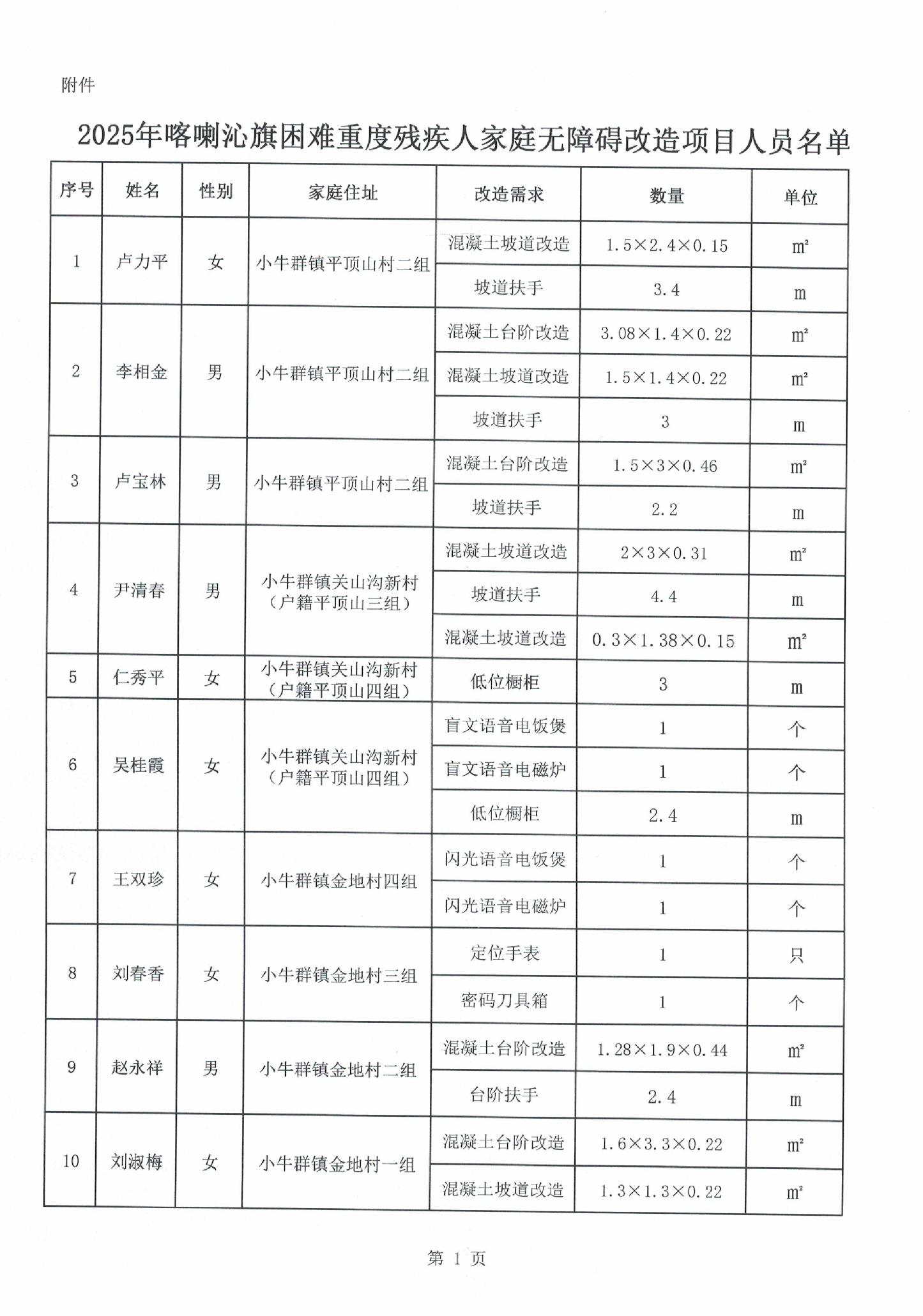 根据《2025年喀喇沁旗困难重度残疾人家庭无障碍改造工作实施方案》要求,我旗已完成本年度46户困难重度残疾人家庭无障碍改造任务,现将改造户名单和使用资金予以公示。