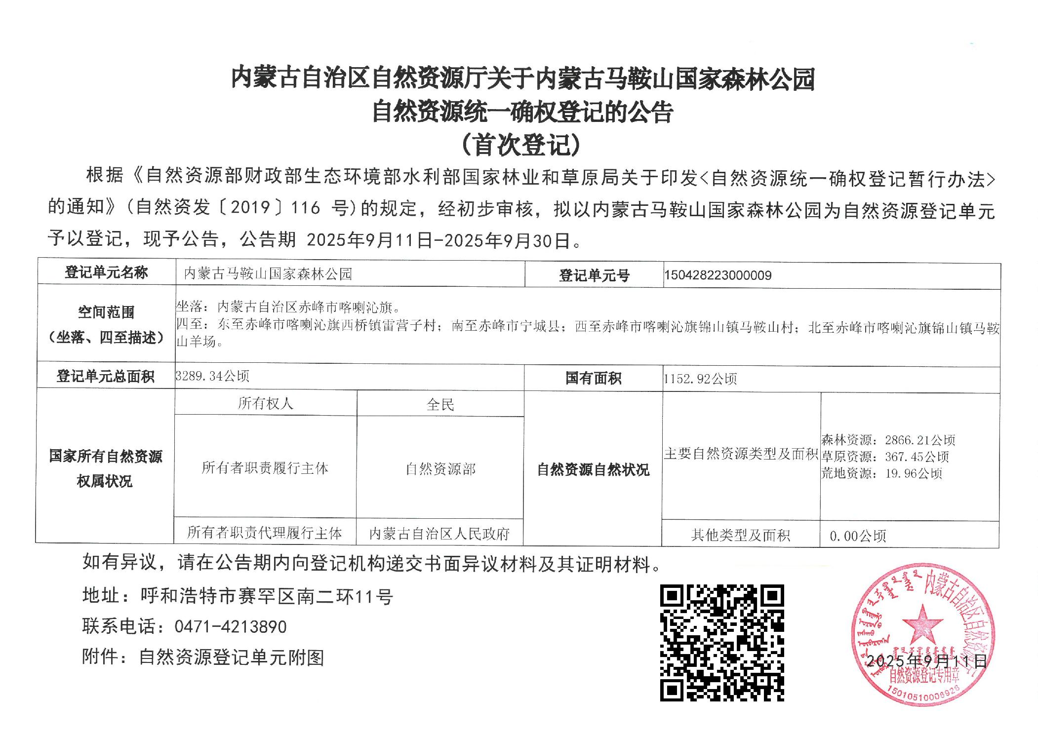 内蒙古自治区自然资源厅关于内蒙古马鞍山国家森林公园自然资源统一确权登记的公告(首次登记)